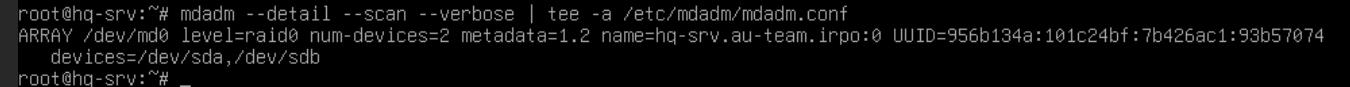 - При помощи двух подключенных к серверу дополнительных дисков размером 1 Гб сконфигурируйте дисковый массив уровня 0 - Имя устройства – md0, при необходимости конфигурация массива размещается в файле /etc/mdadm.conf - Создайте раздел, отформатируйте раздел, в качестве файловой системы используйте ext4 - Обеспечьте автоматическое монтирование в папку /raid Подготовка дисков*HQ-SRV*