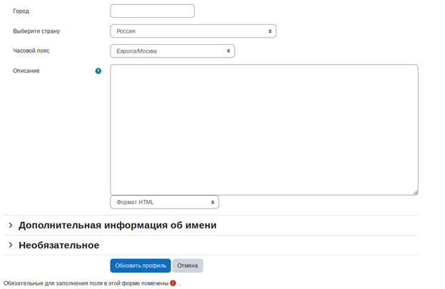 > **РЕКОМЕНДАЦИЯ:** > пока идет долгая установка делаем nginx на hq-rtr, он идет сразу после moodle 8. заполняем необходимые сведения и нажимаем - "Обновить профиль":
