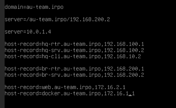 Перезагружаем службу dnsmasq: ***systemctl restart dnsmasq*** После настройки dns-сервера прописываем всем машинам -"HQ-SRV, HQ-RTR, BR-RTR, BR-SRV", кроме HQ-CLI (так как настроили для него dhcp) в /etc/resolv.conf: ***nameserver 192.168.100.2***