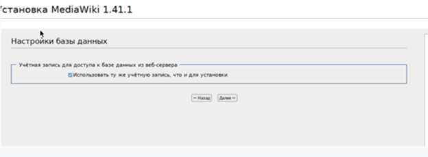 4. Заполняем параметры подключение к Базе Данных в соответствие с заданными переменными окружения в wiki.yml, которые соответствуют требованиям задания: Пример заполнения: Хост базы данных: db Имя базы данных: mediawiki Имя пользователя базы данных: wiki Пароль базы данных: WikiP@ssw0rd