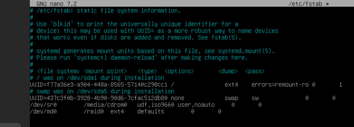 - При помощи двух подключенных к серверу дополнительных дисков размером 1 Гб сконфигурируйте дисковый массив уровня 0 - Имя устройства – md0, при необходимости конфигурация массива размещается в файле /etc/mdadm.conf - Создайте раздел, отформатируйте раздел, в качестве файловой системы используйте ext4 - Обеспечьте автоматическое монтирование в папку /raid Подготовка дисков