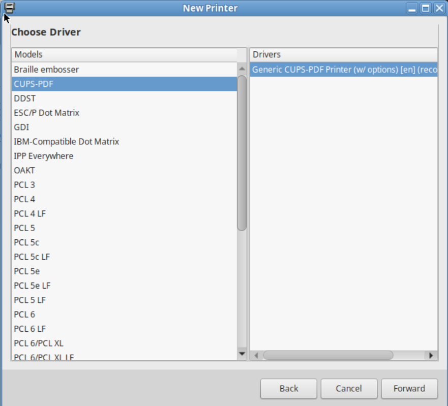 Жмем forward, опять forward, далее листаем вверх и выбираем CUPS-PDF