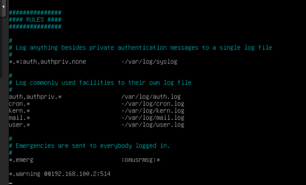 > В блоке MODULES необходимо раскомментировать модули, которые обеспечивают поддержку логирования. (Все кроме модуля imuxsock, потому что вместо него будет использован модуль imjournal). Модуль imjournal придется дописать вручную. Теперь опускаемся в самый низ конфига, там расположены правила. Добавляем в самый конец строку, которая отвечает за отправку логов уровня предупреждения (warning) и выше: ****.warning @@192.168.100.2:514***