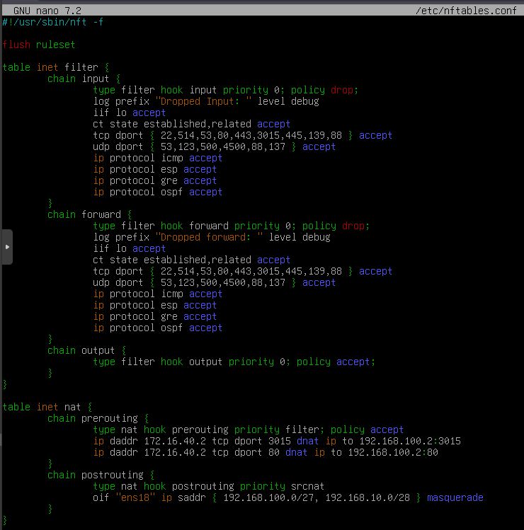 - Скачаем готовый nftables.conf с github, укажем путь для замены нашего nftables: ***apt install dos2unix -y*** ***apt install curl -y*** ***curl -o /etc/nftables.conf https://raw.githubusercontent.com/4bobus/laba/refs/heads/main/files/br-rtr/nftables.conf*** ***dos2unix /etc/nftables.conf*** - Проверяем содержимое файла /etc/nftables.conf: > !меняем префикс(маску) ip-адреса в соответствии со своим заданием!