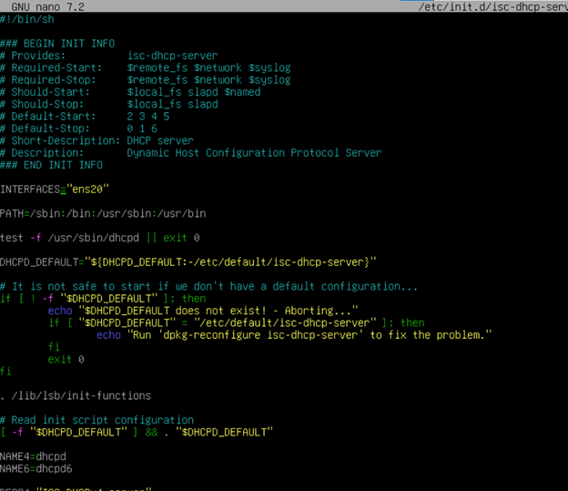 Скачаем: ***apt install –y isc-dhcp-server*** Первым делом нам необходимо указать, что наш DHCP сервер должен принимать запросы только с ens20 интерфейса.