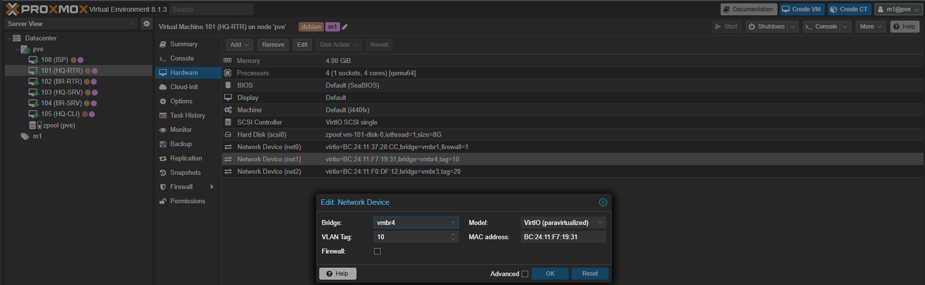 Перед включением виртуалок Настроим вланы. По заданию HQ-SRV в 10 влане, а HQ-CLI в 20. По сути они уже преднастроены, Но можно проверить.
