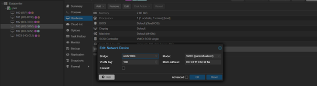 Перед включением виртуалок Настроем вланы. По заданию HQ-SRV в 100 влане, а HQ-CLI в 200