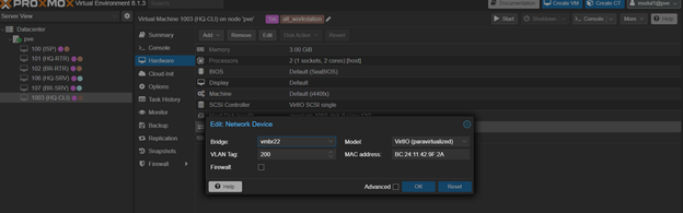 Перед включением виртуалок Настроем вланы. По заданию HQ-SRV в 100 влане, а HQ-CLI в 200