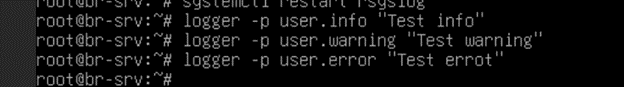 Добавим несколько записей различного уровня в лог на любом из клиентов, например на BR-SRV, командами: